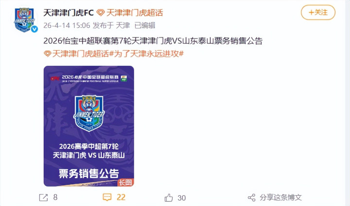 4月21日20点,天津津门虎将在主场迎战山东泰山队。4月14日15:06,天津津门虎正式官宣与山东泰山队的票务销售公告。通过公告可知,本场比赛票价信息正式公布,票价分别为人民币80、120、160、200、280和380元,票价十分亲民。山东距离天津不远,相信会有更多山东球迷赶赴津门虎主场观看比赛。